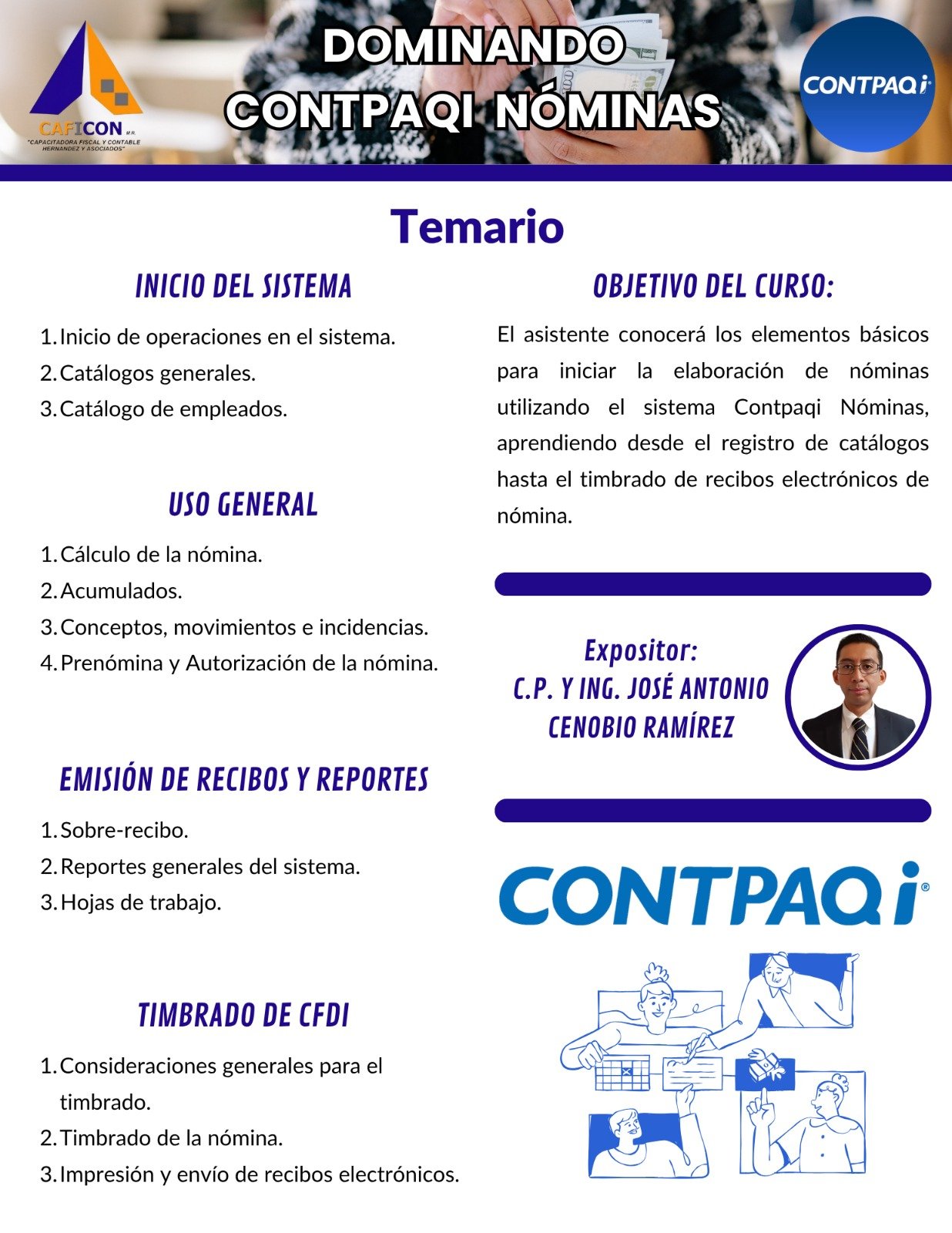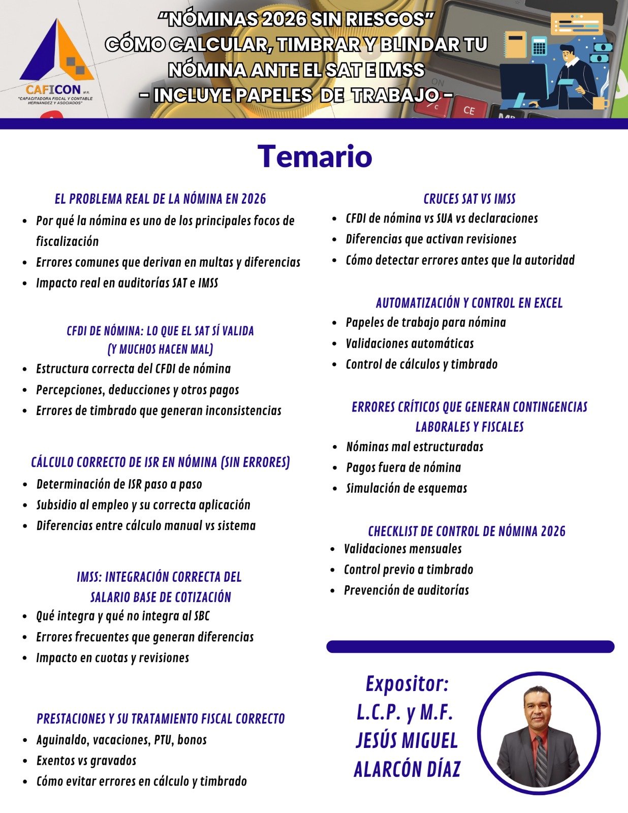 Nuestros cursos combinan teoria y practica, impartidos por especialistas con amplia experiencia, para brindarte herramientas claras, actuales y aplicables a la realidad profesional. Dirigido a contadores, administradores, empresarios y profesionales que buscan minimizar riesgos, optimizar procesos y actuar con seguridad juridica.